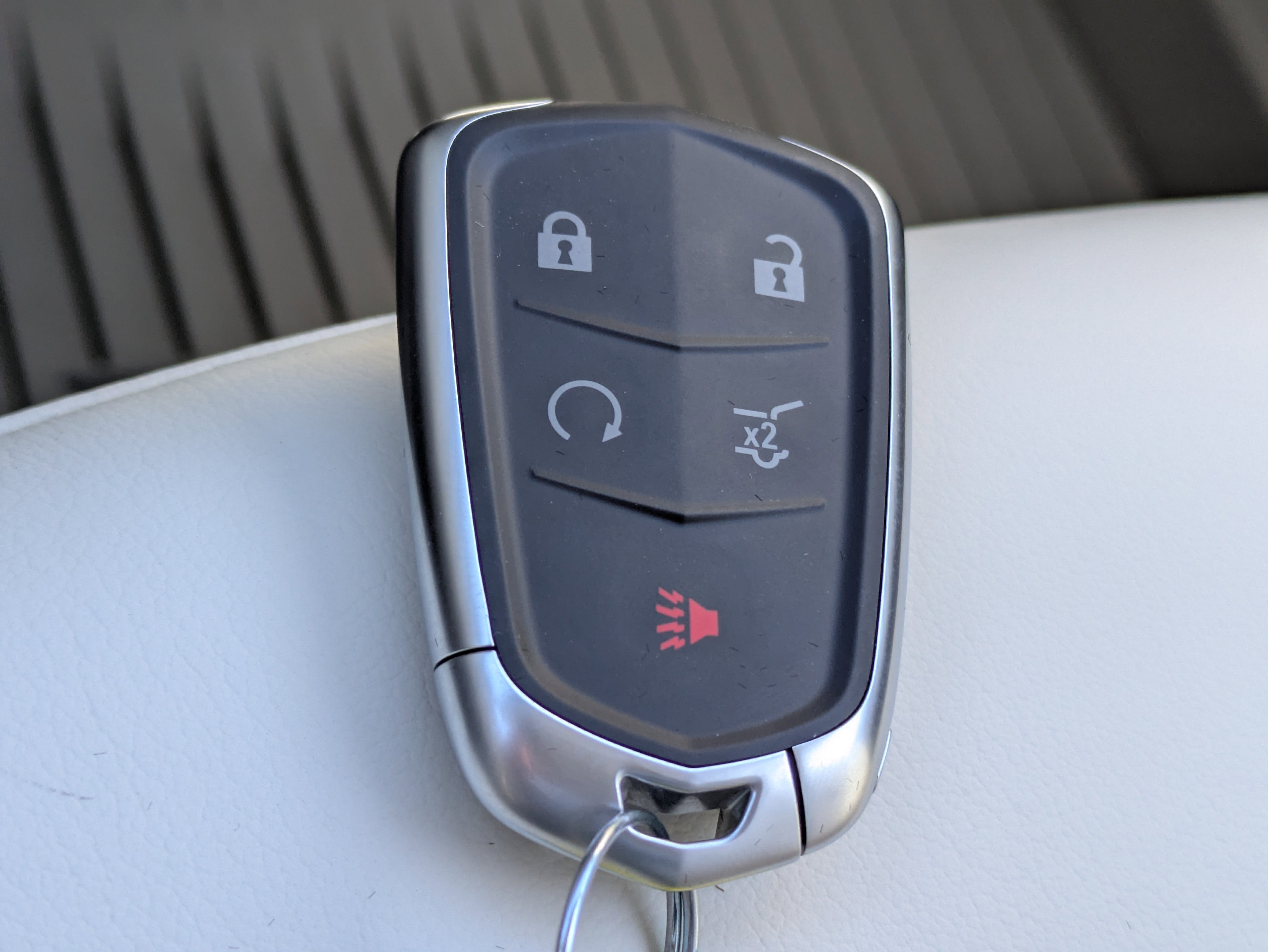 - Opens or closes when the system senses the key fob and the driver extends their foot under the left-hand side of the rear bumper over an image of the Cadillac Crest projected under the vehicle