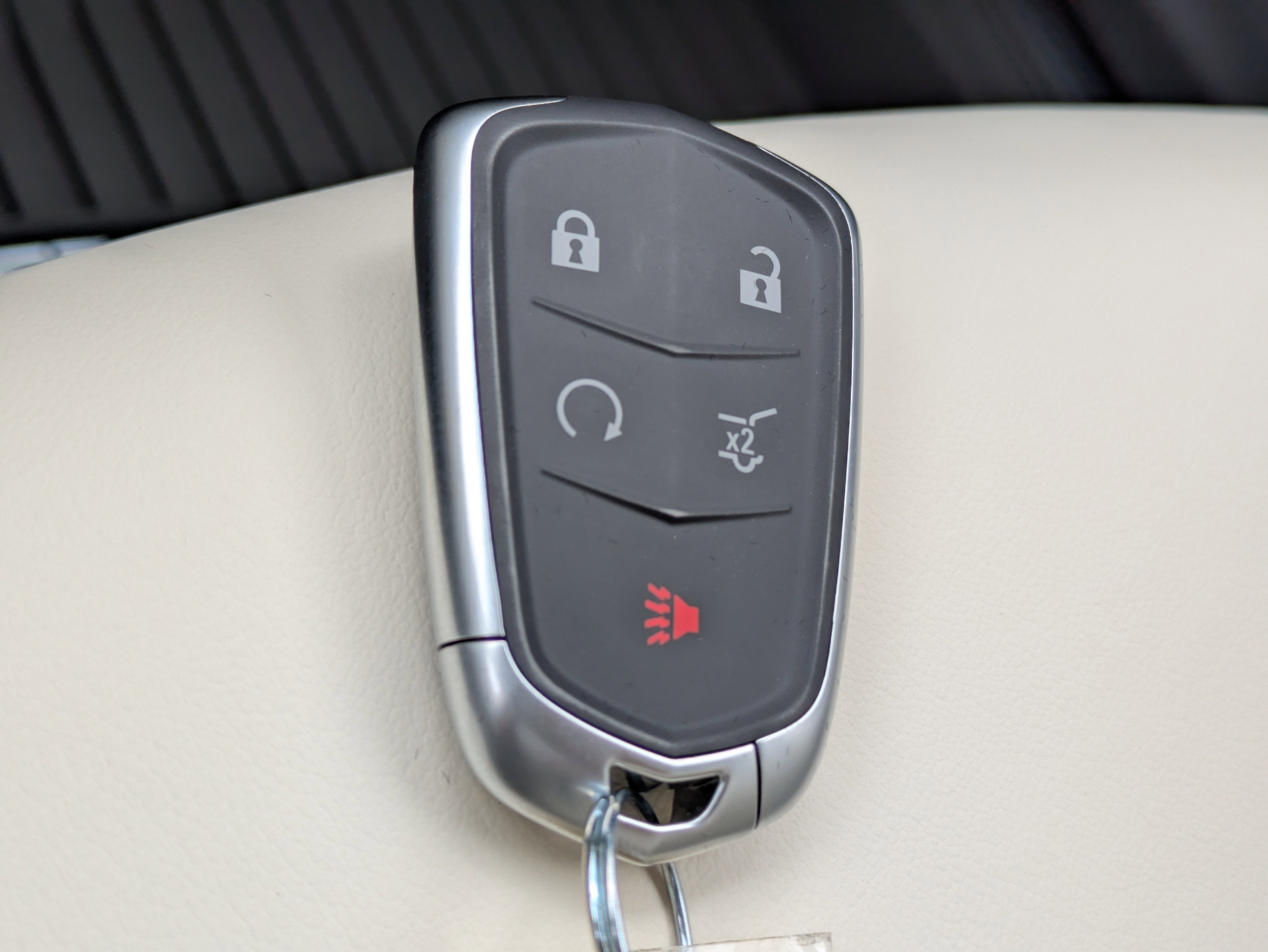 - Opens or closes when the system senses the key fob and the driver extends their foot under the left-hand side of the rear bumper over an image of the Cadillac Crest projected under the vehicle