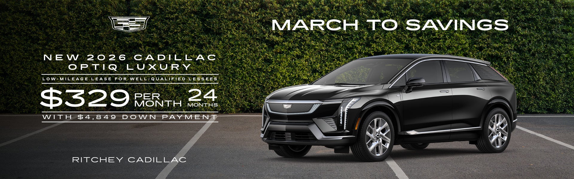 For Current Owners and Lessees of 2012 model year or newer Acura, Audi, BMW, Ford, Honda, Hyundai, Infiniti, Jeep, Kia, Lexus, Lincoln, Mercedes-Benz, Toyota, Volvo, Porsche, Tesla, Genesis, Polestar and Rivian vehicles : Each dealer sets own price. $329/month for 24 months. Your payments may vary. Payments are for a 2026 CADILLAC OPTIQ RWD Luxury with an MSRP of $53,420. Based on due at signing amount of $4,869 (after all offers). 24 monthly payments total $7,896. Must show proof of ownership/lease. Option to purchase at lease end for an amount to be determined at lease signing. Lessor must approve lease. Take new retail delivery by 03-31-2026. Lessee pays for maintenance, repair, excess wear and disposition fee of $595 or less at end of lease. No security deposit required. Payments may be higher in some states. Not available with other offers. Take new retail delivery by 03-31-2026.